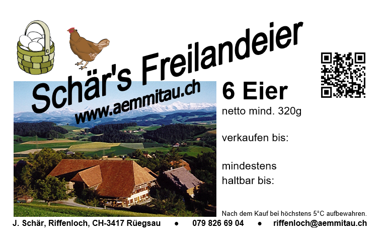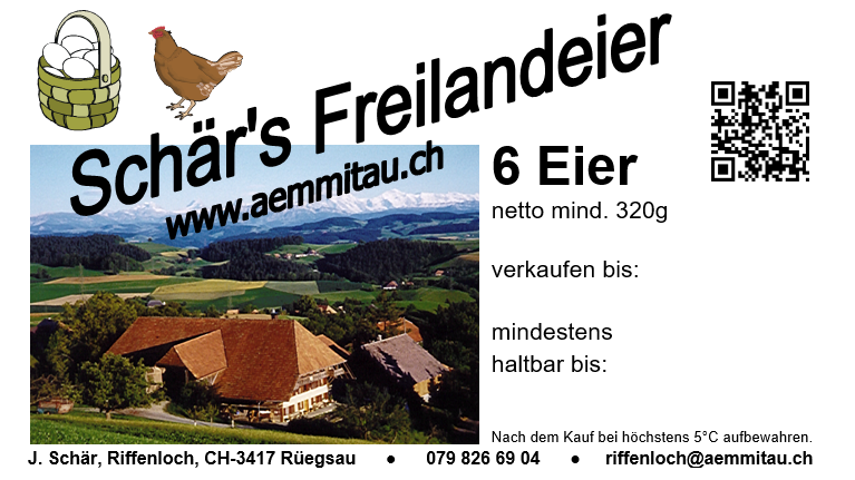 Versorgen Sie sich mit Schär's Freilandeiern von unseren eigenen Hühnern oder machen Sie jemandem eine Freude und schenken Sie ein Schachteli Schär's Freilandeier!